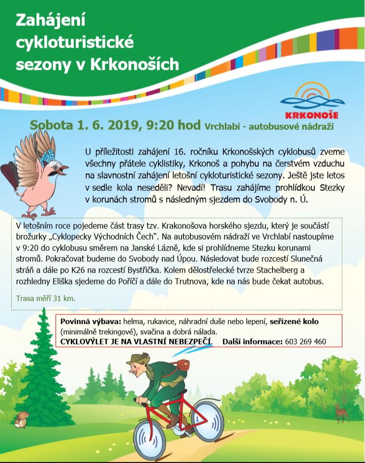 Zveme vás na již 16. ročník zahajovací jízdy Krkonošských cyklobusů. V letošním roce pojedeme část trasy tzv. Krakonošova horského sjezdu, který je součástí brožurky „Cyklopecky Východních Čech“.