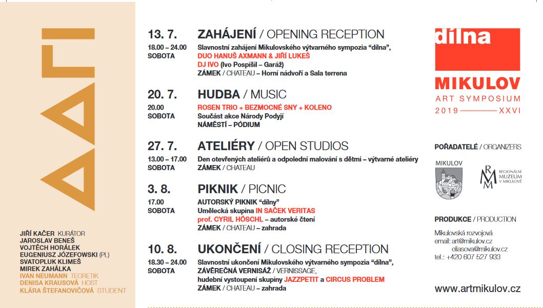 Slavnostní zahájení 26. ročníku Mikulovského výtvarného sympozia “dílna“ se koná 13. července na mikulovském zámku. Kurátor a sochař Jiří Kačer na něj letos pozval malíře Vojtěcha Horálka, Jaroslava Beneše, Svatopluka Klimeše, Mirka Zahálku. Z Polska přijede Eugeniusz Józefowski. Hostem sympozia je malířka Denisa Krasová. Technickou asistentkou bude studentka Klára Štefanovičová z Bratislavy. Celý umělecký tým […]