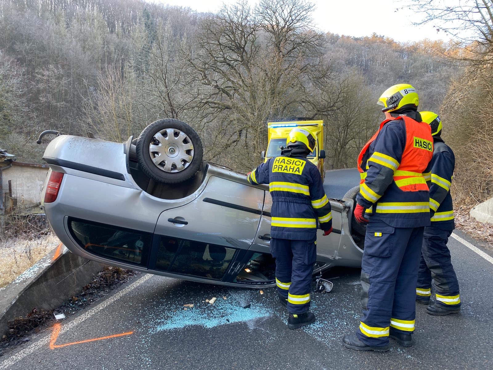 Převrácené auto na střeše v ulici K Zadní kopanině zajistila jednotka pražských hasičů z radotínské stanice.