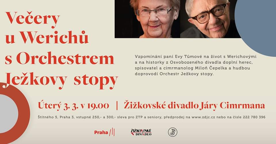 V úterý 3.3.2020 v 19.00 pořádá Orchestr Ježkovy stopy v Žižkovském divadle Járy Cimrmana akci s názvem Večery u Werichů s Evou Tůmovou, Miloněm Čepelkou a Orchestrem Ježkovy stopy.