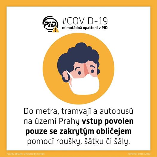 Žádáme všechny cestující, aby od úterý 17. března 2020 vstupovali do přepravního prostoru pražské MHD pouze se zakrytým nosem a ústy.