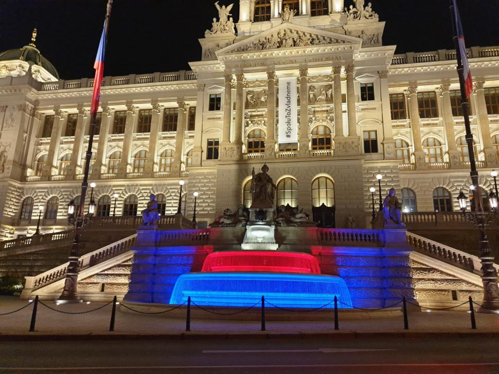Po několikaměsíční pauze, kdy byla fontána před Historickou budovou Národního muzea uložena k zimnímu spánku, se opět tento originální vodní prvek na vrcholku Václavského náměstí rozzáří, tentokrát barvami trikolory. První spuštění proběhlo v pátek 1. května ve 20.00 hodin.