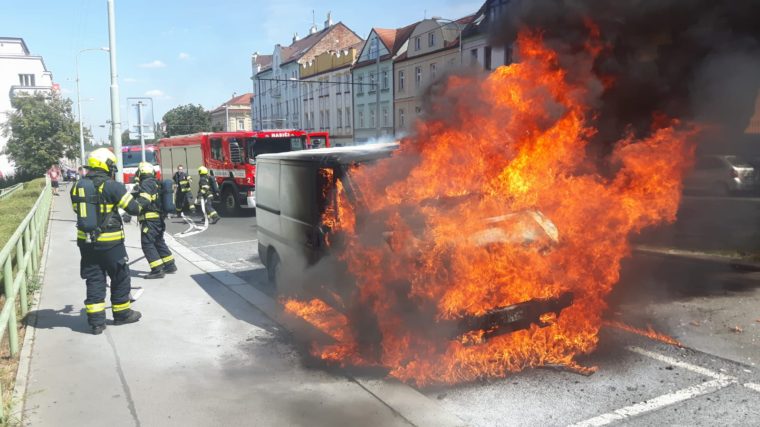 Požár dodávky v plném rozsahu mají pod kontrolou petřinští hasiči v ul. Bělohorská na Břevnově.