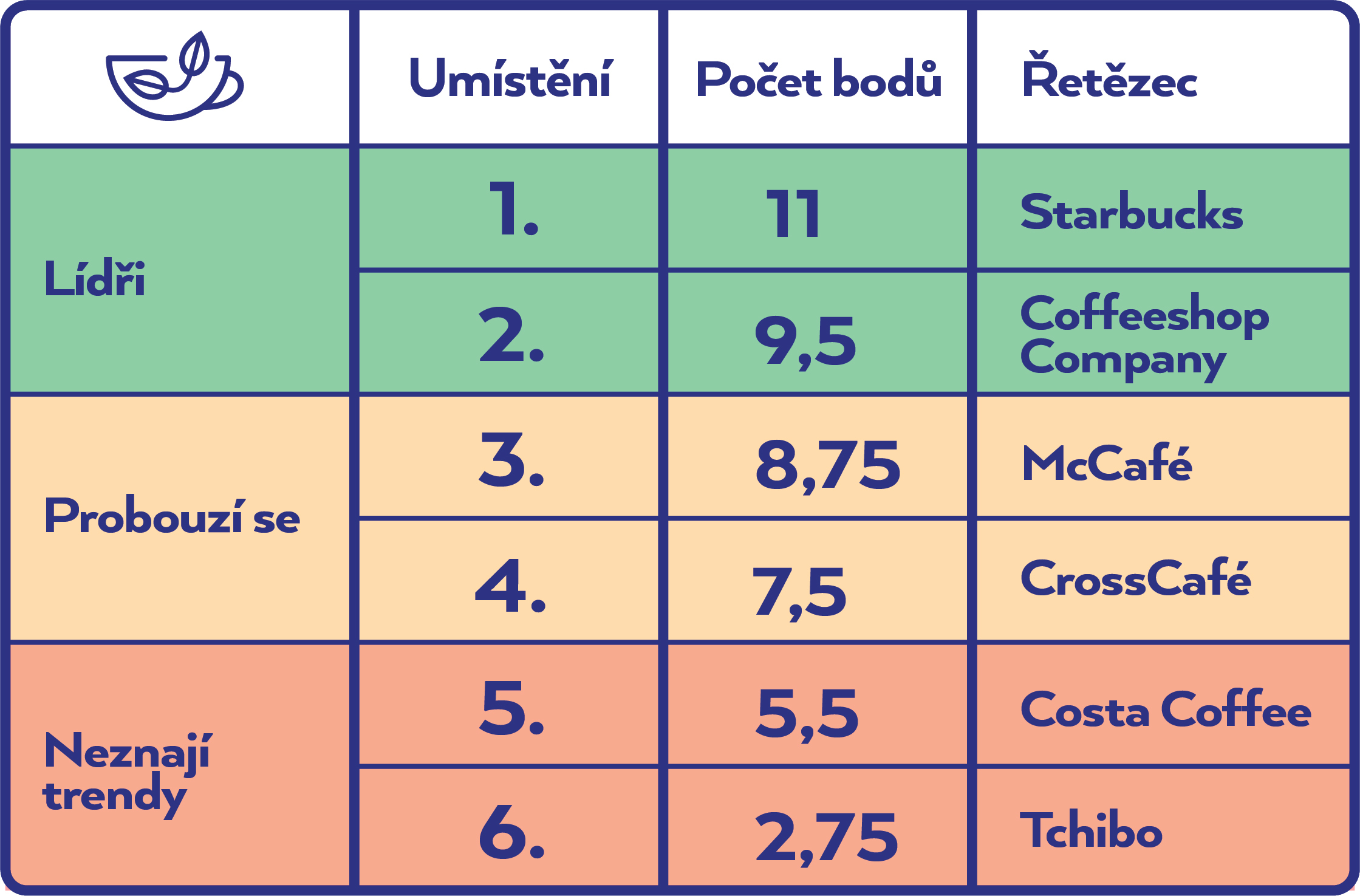 Velké kavárenské řetězce v Česku začínají naslouchat požadavkům zákazníků preferujících rostlinné alternativy mléka a jiných živočišných produktů. Nejvíce jde současnému trendu naproti americký Starbucks, naopak na chvostu zůstalo Tchibo, ukázal nedávný průzkum projektu Rostlinně.