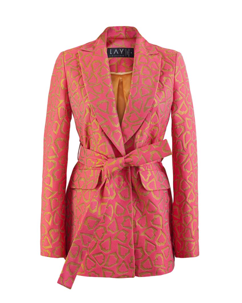 Modely designérky Lay Sedlákové jsou vždy naprosto nepřehlédnutelné a otevírají dveře do vyšších pater módy. Typickým příkladem je ručně šité žakárové sako v barvě malin a zlatavého medu.