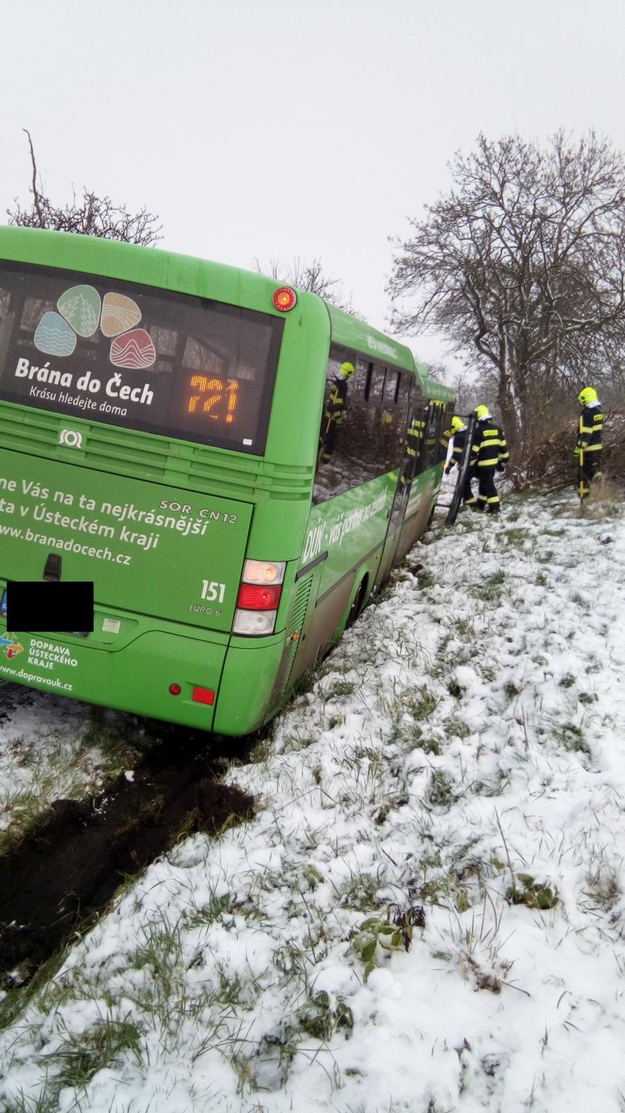 Jednotky ze stanic Most a Bitozeves vyprostily linkový autobus, který zapadl do příkopu u obce Havraň, okres Most.