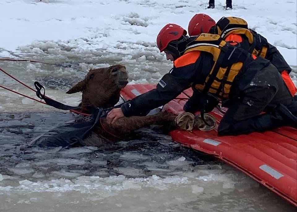 Záchrana kobylky probořené v ledu kilometr od břehu. Díky výborné práci našich vodních záchranářů a hasičů Frymburk se kobylku podařilo zachránit.