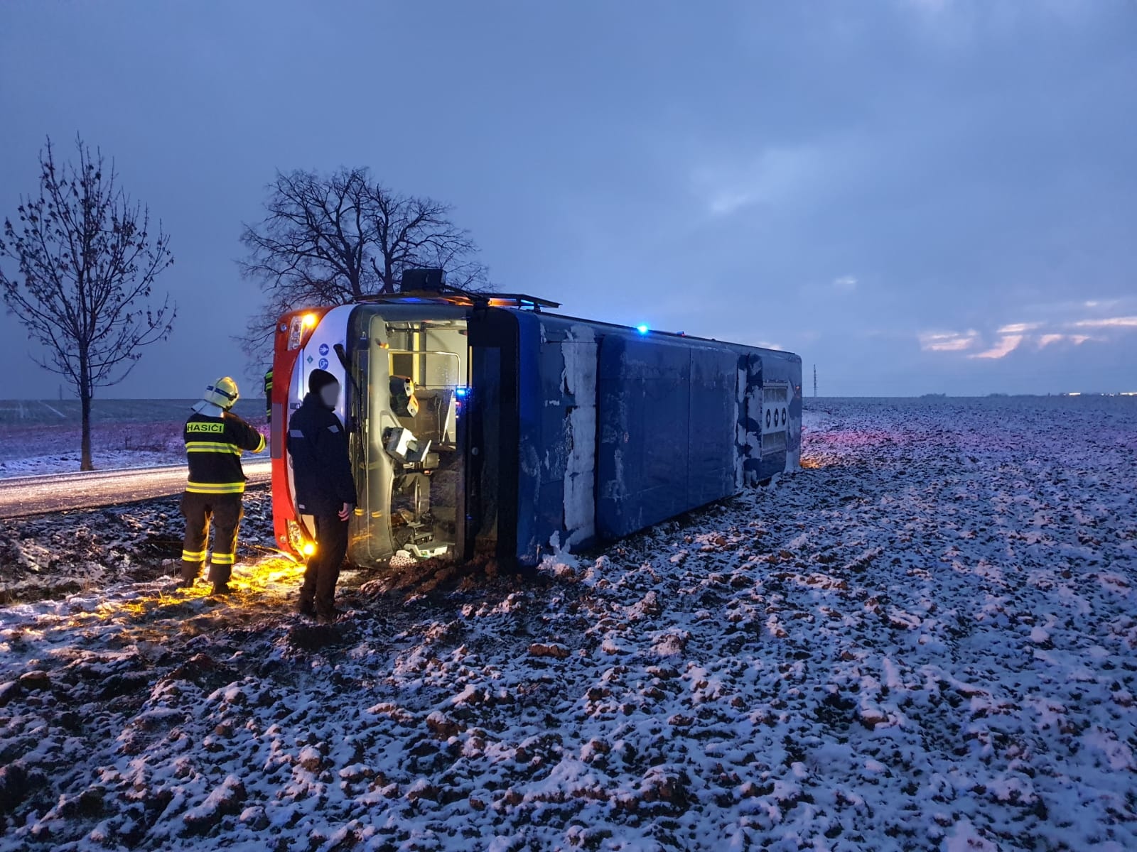 Jednotka HZS Kladno vyjela k dopravní nehodě autobusu, který skončil na boku mimo komunikaci.