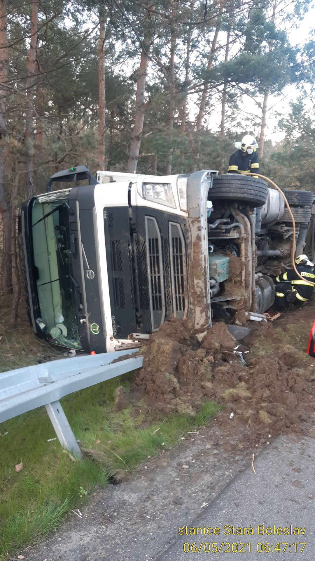 Hasiči ze stanice Stará Boleslav s rychlým zásahovým automobilem, cisternou a kontejnerem na ropné havárie zasahují u kamionu na boku.