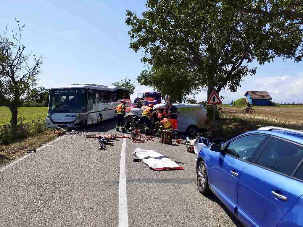 Hasiči zasahují u dopravní nehody osobního vozu a autobusu mezi Hajany a Ořechovem