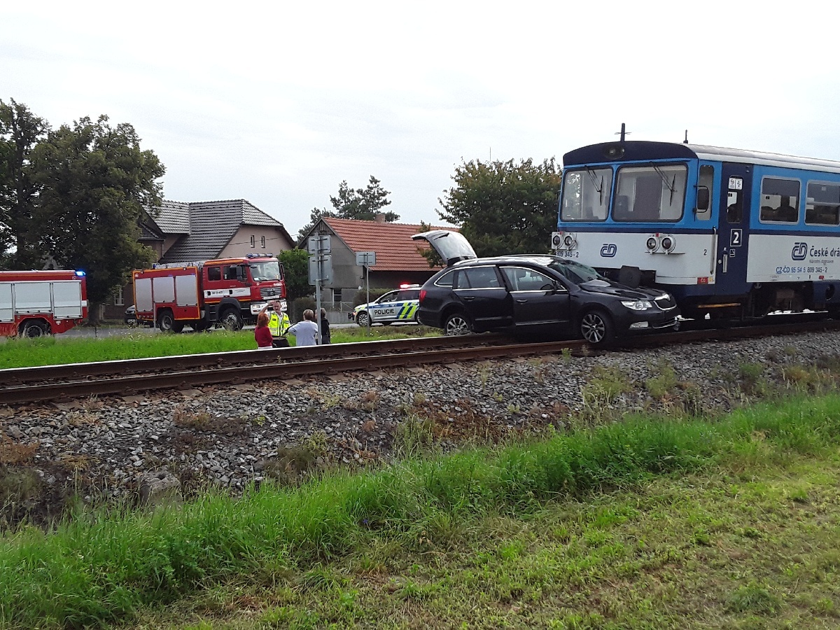 Tři jednotky hasičů zasahují u dopravní nehody vlaku a automobilu na přejezdu č. P2553 u obce Vražkov na Roudnicku.