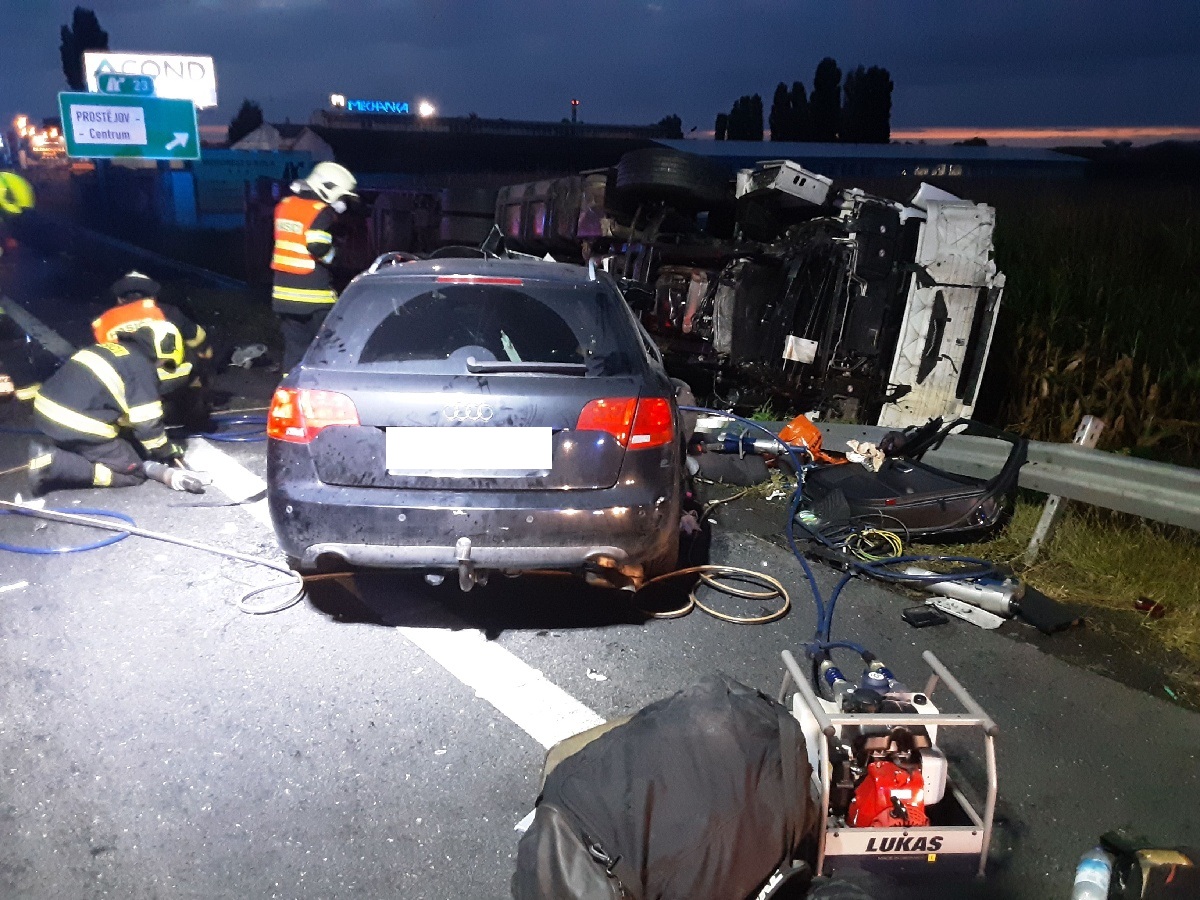 Hasiči zasahovali u tragické dopravní nehody na D46 u Prostějova. Jeden člověk při srážce kamionu a osobního automobilu zemřel, další tři se zranili. Dva z nich jsme vyprostili ze zdemolovaného vozu hydraulickými nástroji a předali je záchranářům. Doprava je zastavena v obou směrech. (LB)