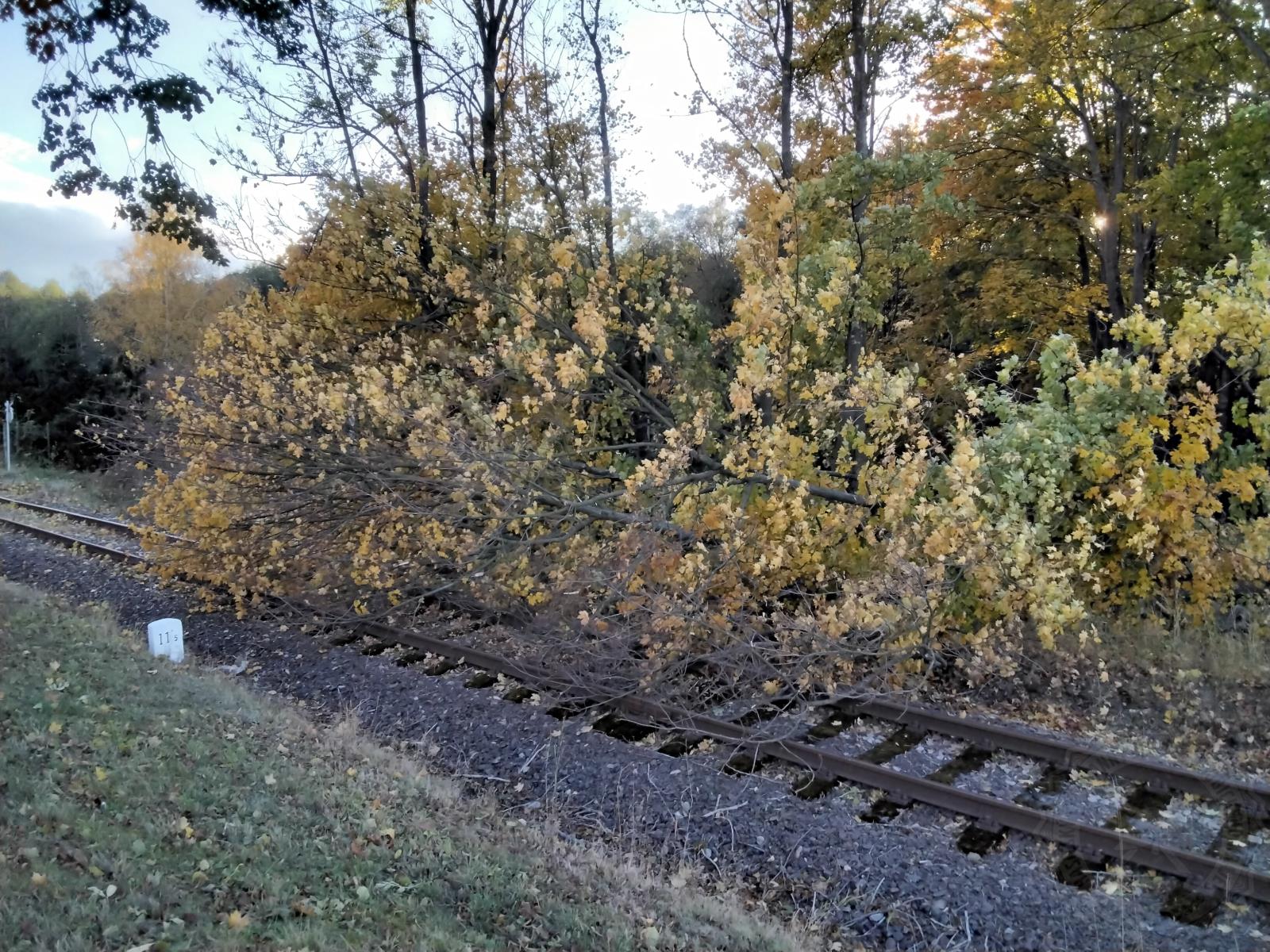 Pád stromu na trať . Na odstranění překážky pracuje Správa železnic s.o. Čas obnovení provozu bude aktualizován dle postupu prací.