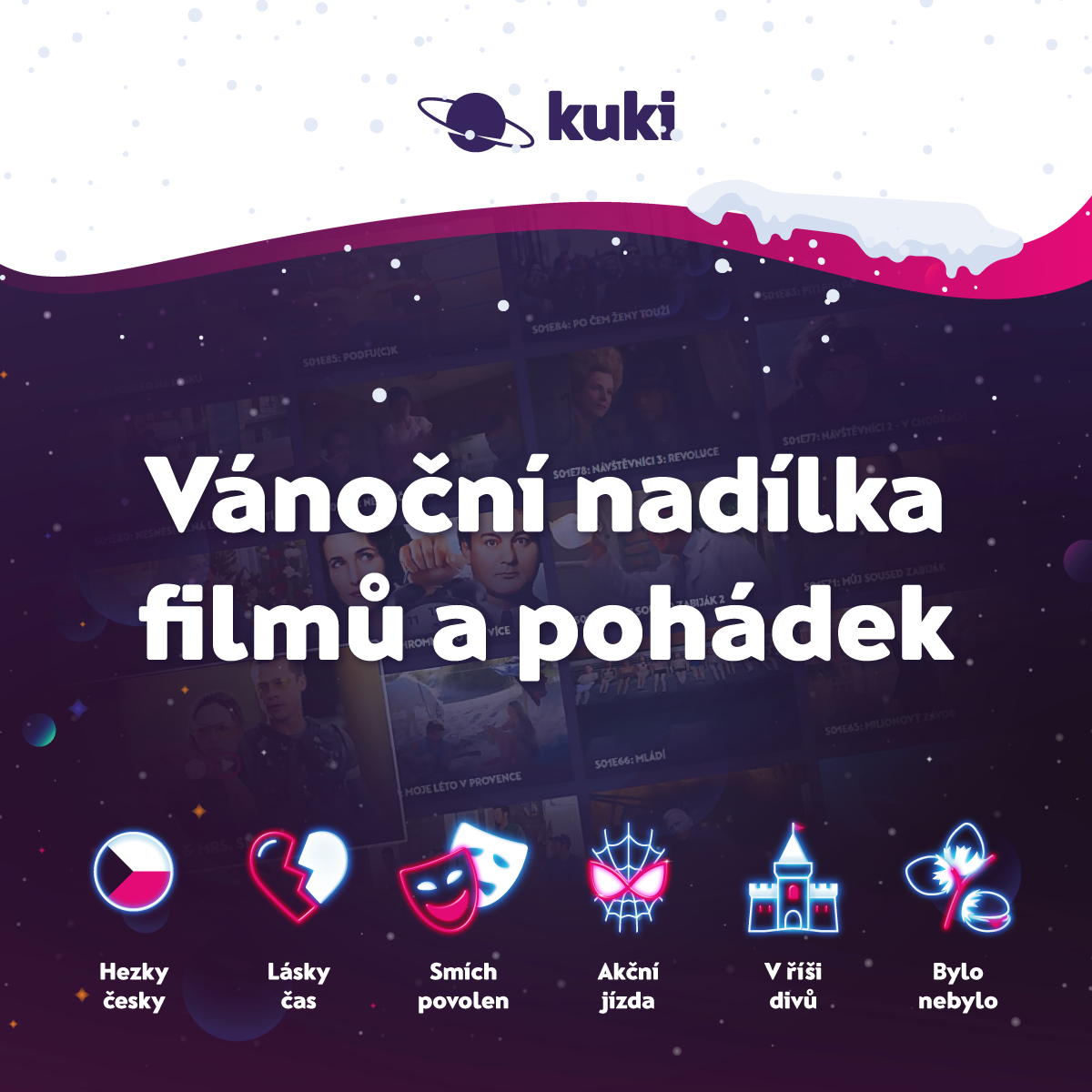 Česká klasika, hrané i kreslené pohádky nebo komedie, které trhají bránice. Internetová televize Kuki všem svým zákazníkům pod stromeček věnovala předčasný dárek v podobě vánoční nadílky filmů a pohádek. Jsou rozdělené do 6 tematických sbírek a v Kuki budou dostupné od 6. prosince 2021 do 30. ledna 2022. Na diváky čeká celkem 450 snímků.