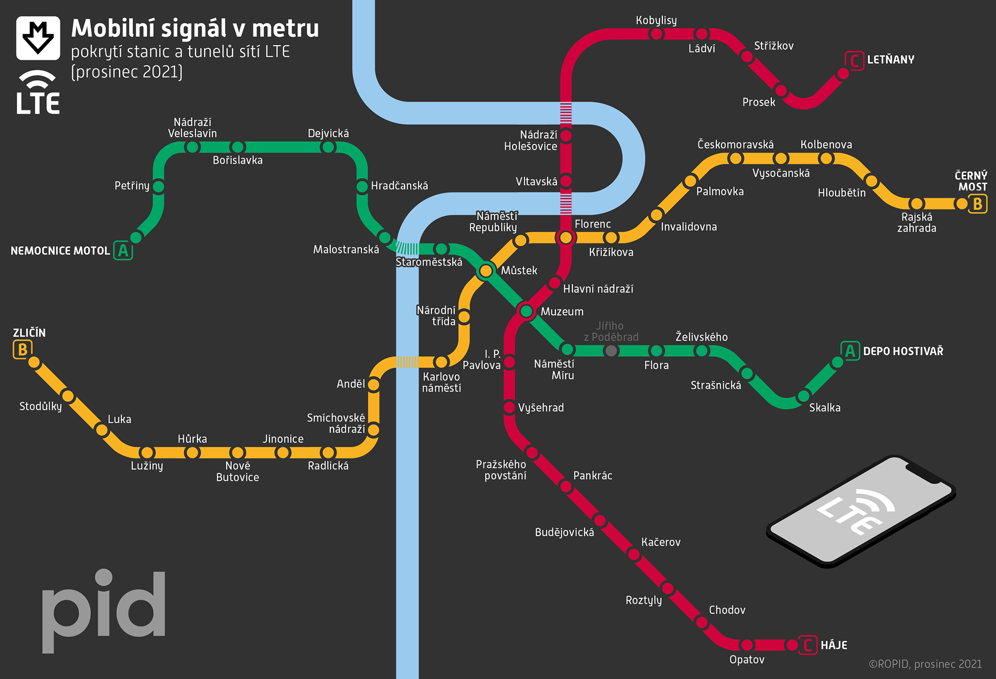 Od 21.12.2021 je signál v kvalitě LTE (4G) v celé síti pražského metra. Konsorciu operátorů O2 Czech Republic, T-Mobile Czech Republic, Vodafone Czech Republic a společnosti CETIN se dnes ve spolupráci s Dopravním podnikem hl. m. Prahy (DPP) podařilo připojit poslední úsek Rajská zahrada – Černý Most na trase B. Práce na tomto projektu začaly už v roce 2015 a původně měly trvat do konce roku 2022. I přes dopady pandemie covid-19 se pokrývání pražského metra vysokorychlostním mobilním signálem LTE podařilo urychlit o jeden rok.