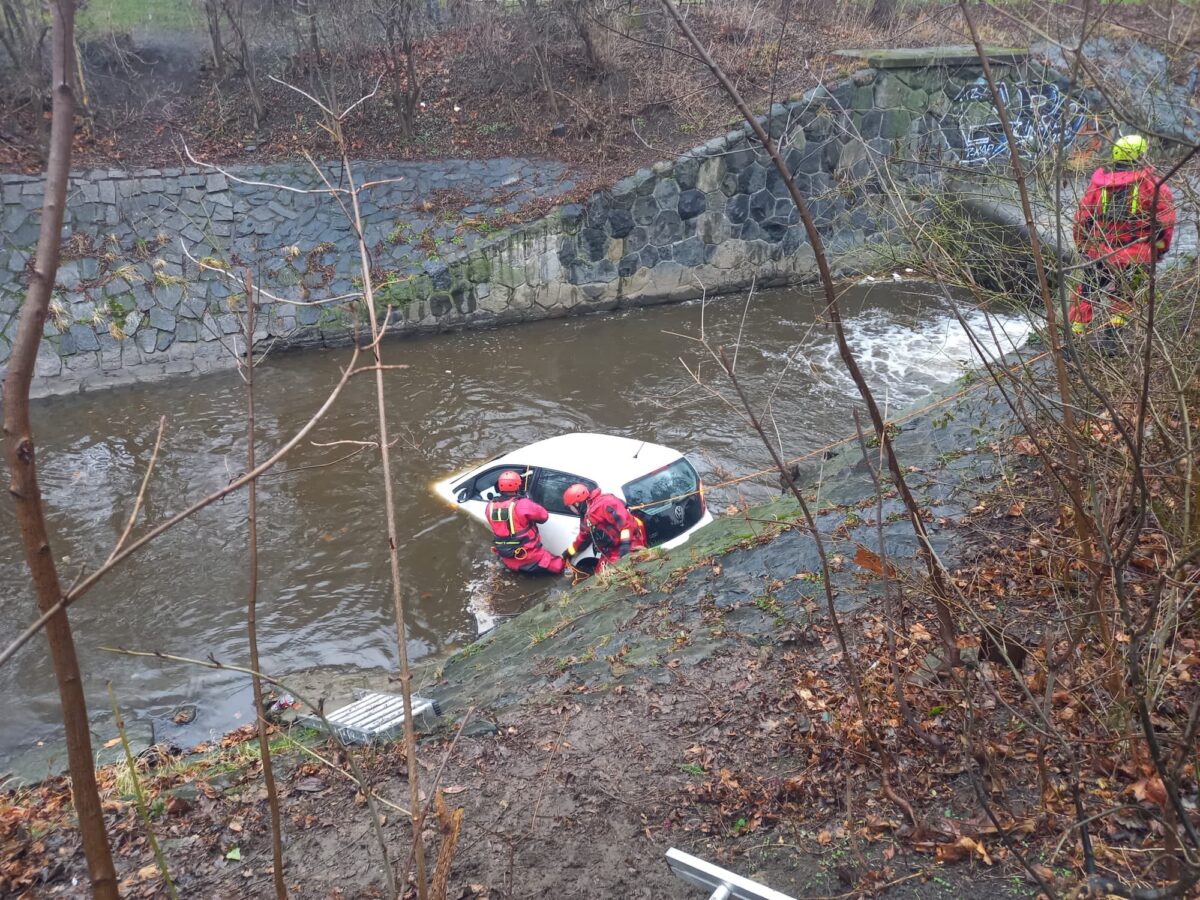 Do Botiče ve Vršovicích sjelo osobního auto a uvízlo tam.