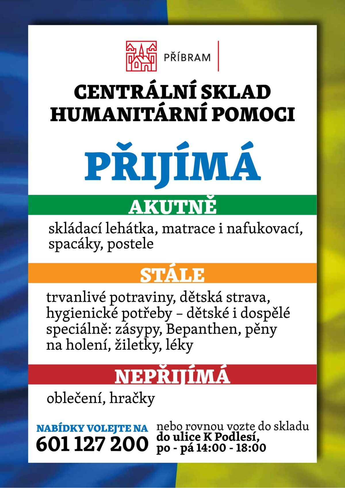 Příbramské Sběrné místo humanitární pomoci od dnešního dne funguje v novém režimu, kdy jeho otevírací doba je denně od 14 do 18 hodin. Aktualizovaný je také seznam potřeb.