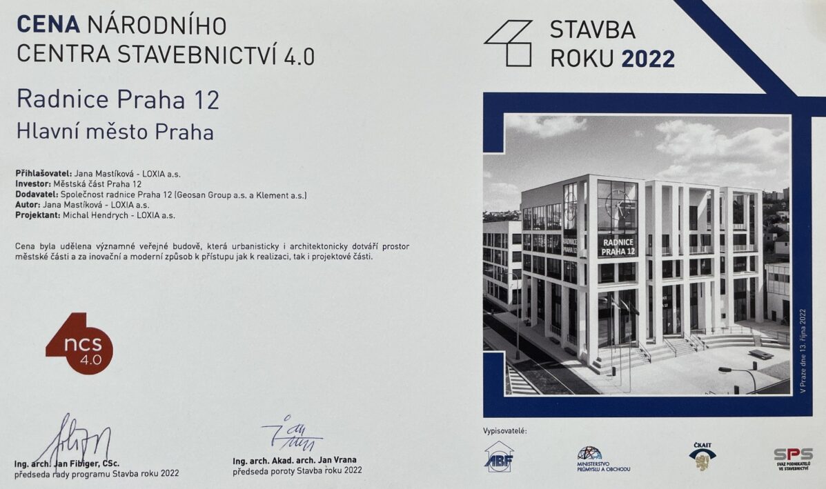 Cenu Národního centra stavebnictví 4.0 získala budova nové radnice městské části Praha 12. Ocenění bylo uděleno významné veřejné budově, která urbanisticky i architektonicky dotváří prostor městské části a za inovační a moderní přístup jak k realizaci, tak i projektové části.