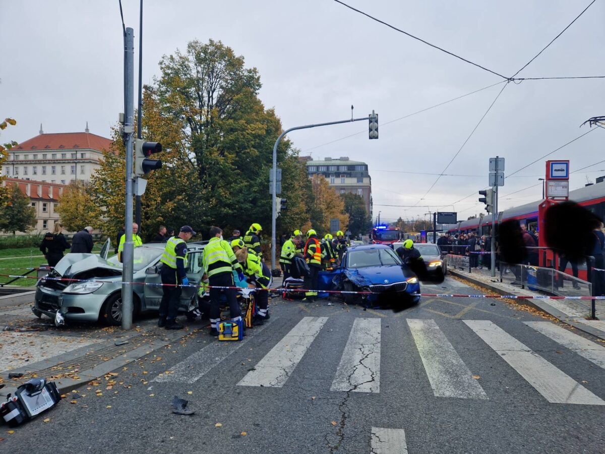 U dopraví nehody tří osobních automobilů na Palackého náměstí zasahuje inspektor a tři posádky záchranářů i lékař.