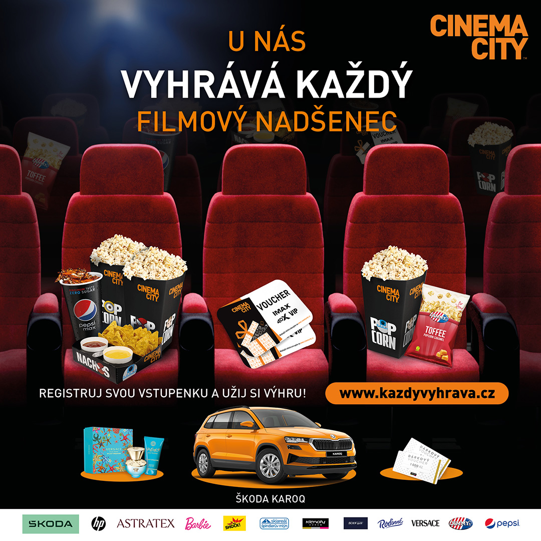 Oblíbená letní soutěž vtrhla do multiplexů Cinema City po celé České republice. Nezáleží na tom, jestli si do kina přijdete užít bláznivou komedii, akční trhák nebo si naopak plánujete odpočinout u animáku. Výhra na vás totiž čeká doslova na každé sedačce. Ve hře je, mimo jiné, nový automobil Škoda Karoq, luxusní kosmetické balíčky, vstupenky do kina, občerstvení a dalších více než 360 tisíc cen.