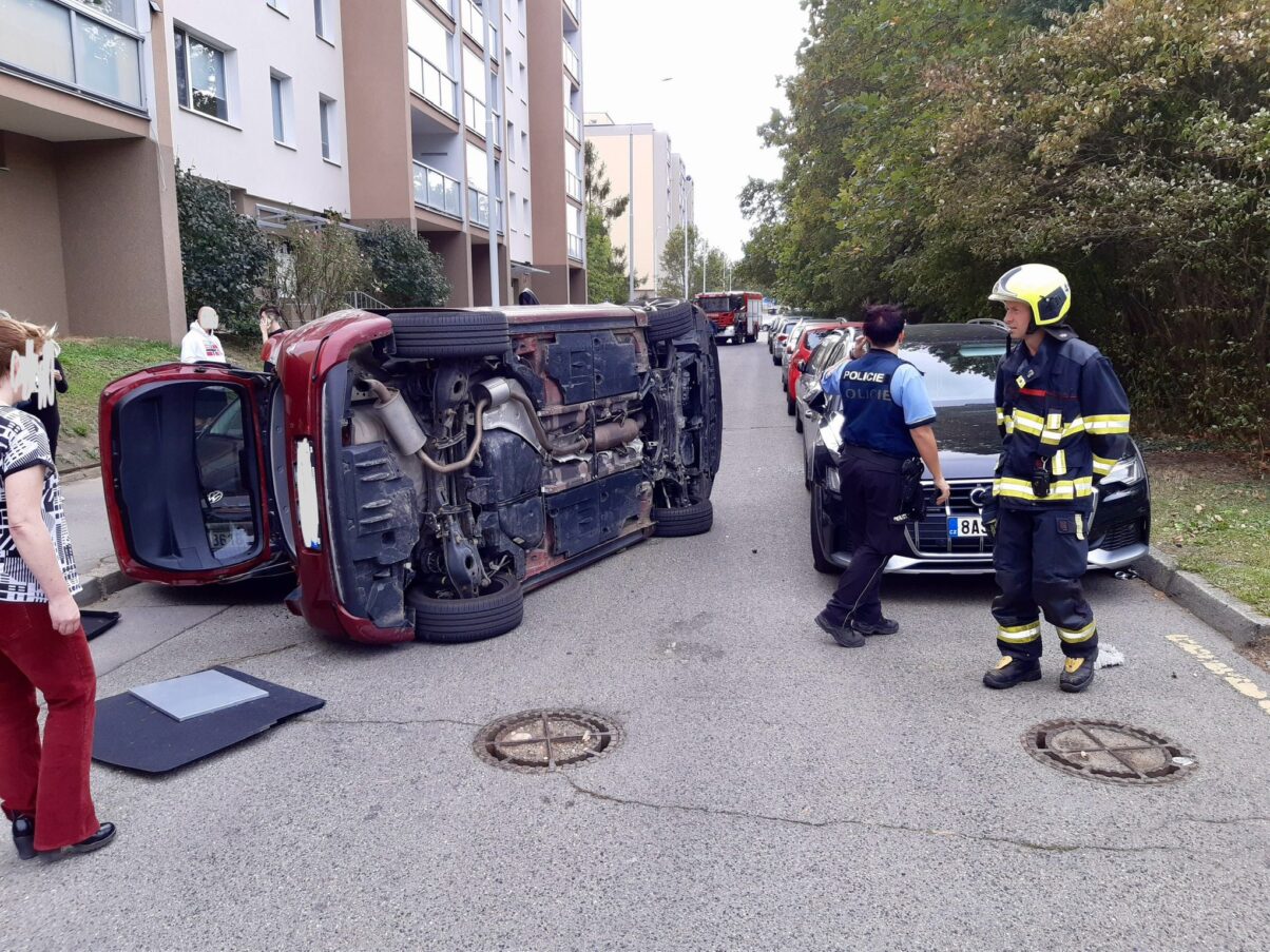 V ulici Ledvinova zasahovali Hasiči Praha u osobního auta na boku. Nikdo nebyl zraněn, vozidlo stavíme na kola vyprošťovacím vozidlem s rukou.