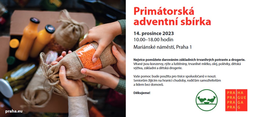 Praha ve spolupráci s Potravinovou bankou pro Prahu a Středočeský kraj připravila tradiční Primátorskou adventní sbírku, která se letos uskuteční ve čtvrtek 14. prosince 2023 na Mariánském náměstí od 10:00 do 18:00 hodin. Představitelé hlavního města, zaměstnanci Magistrátu hl. m. Prahy, ale i městských organizací nebo zástupci velvyslanectví sídlících v metropoli, různé instituce, soukromé firmy i široká veřejnost může darováním základních trvanlivých potravin nebo drogerie pomoci spoluobčanům v nouzi.