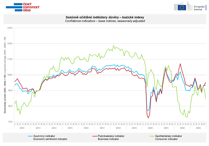 Souhrnný indikátor důvěry (indikátor ekonomického sentimentu), vyjádřený bazickým indexem, se meziměsíčně znovu mírně zvýšil o 0,3 bodu na hodnotu 93,4, při rozdílném vývoji jeho složek. Indikátor důvěry podnikatelů vzrostl o 1,7 bodu na hodnotu 95,2 a indikátor důvěry spotřebitelů se snížil o 5,8 bodu na hodnotu 84,9.