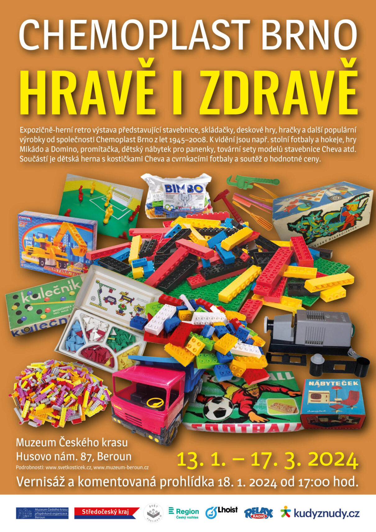 Přijďte si do Berouna nostalgicky zavzpomínat na dětství. Ve zdejším Muzeu Českého krasu budou k vidění oblíbené retro hračky. Expozičně-herní výstava Chemoplast Brno hravě i zdravě představí populární stavebnice, skládačky, deskové hry a další výrobky od společnosti Chemoplast Brno z let 1945–2008.