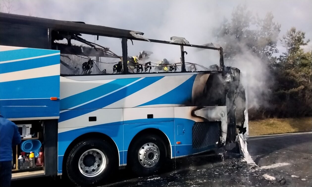 D35, úsek 267,5 km směr na Ostravu likvidovali hasiči zahoření autobusu od motorové části, plameny dopravní prostředek zcela poškodily.