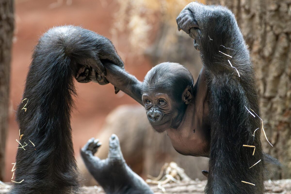 Dvouměsíční samička gorily nížinné Mobi v Zoo Praha se živě zajímá o své okolí. V posledních dnech k tomu přispěla lepší fixace hlavy, a tak už gorilí kojenec cíleně reaguje na všelijaké podněty. Stále více se rozhlíží, zatímco ji matka Duni vozí na hřbetě nebo ji zvedá do výšky a protahuje tak malé gorilce břicho i končetiny.