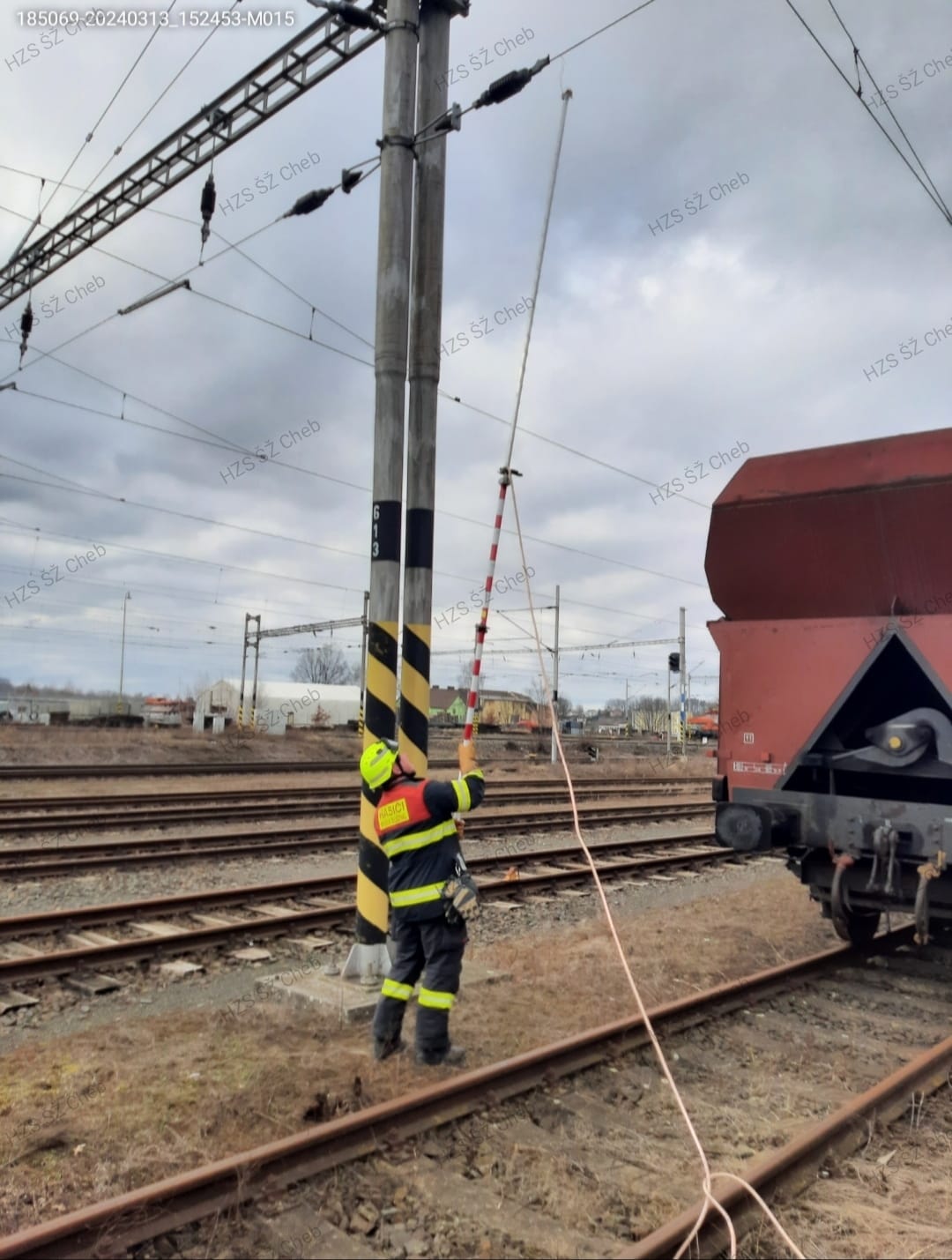 Včera ve 14:39 hodin vyjela směna A s CAS 20 Scania do žst. Cheb ke koleji číslo 610, kde byla hlášená osoba na železničním vagónu. Před příjezdem jednotky došlo k propojení osoby s trakčním vedením a vznikl elektrický výboj, který osobě způsobil popáleniny druhého – třetího stupně.