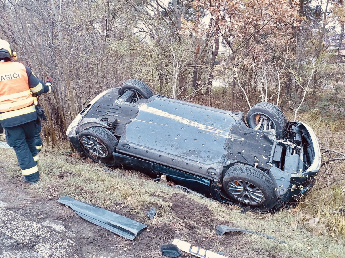 Nehoda v ulici Starokolínská. Hasiči budou vozidlo vyprošťovat z příkopu.