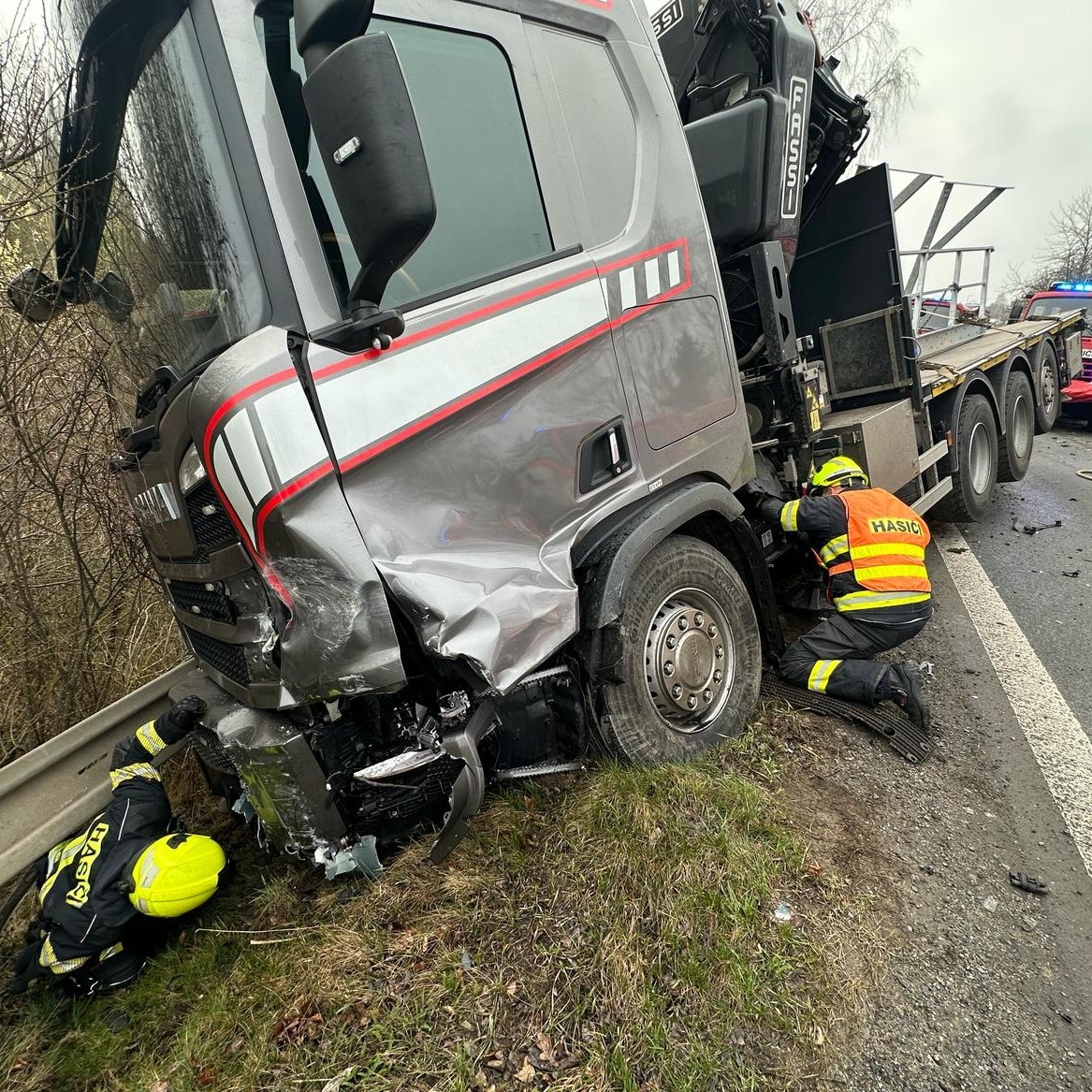 Dopravní nehodu osobního a nákladního automobilu řešili krátce před devátou hodinou profesionální hasiči z Říčan a Českého Brodu. Obě vozidla zůstala po střetu mimo vozovku.