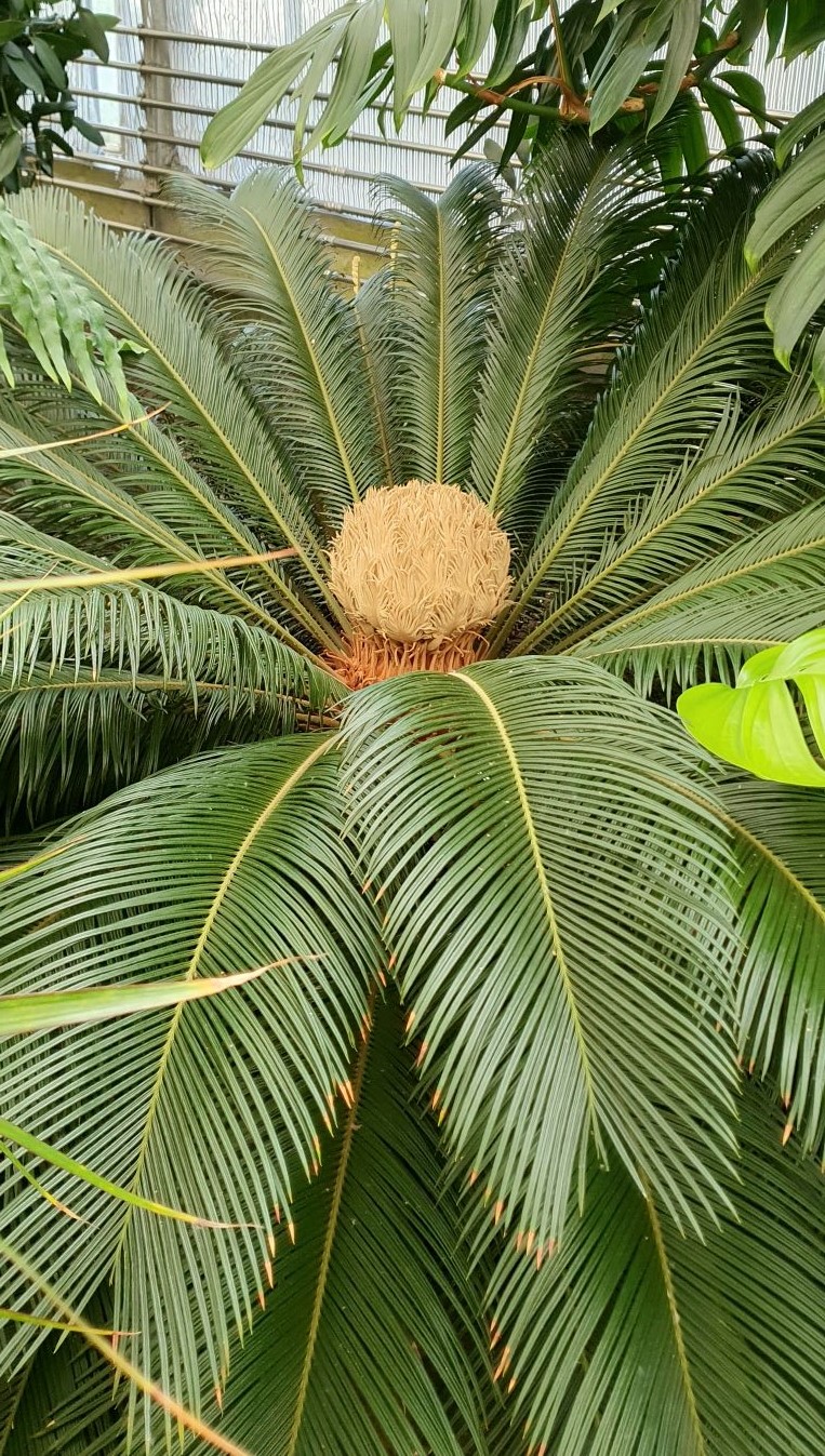 Přestože tak vypadá, o palmu se nejedná. Jde o cykas japonský patřící spolu s jinany a jehličnany mezi nahosemenné rostliny. V Zoo Ostrava mají tuto starobylou rostlinu v tropickém skleníku, kde ji mohou zájemci obdivovat při víkendových komentovaných prohlídkách. A že je co obdivovat! Cykas zde právě kvete, což se děje poměrně zřídka, obvykle pro mnoha desítkách let.