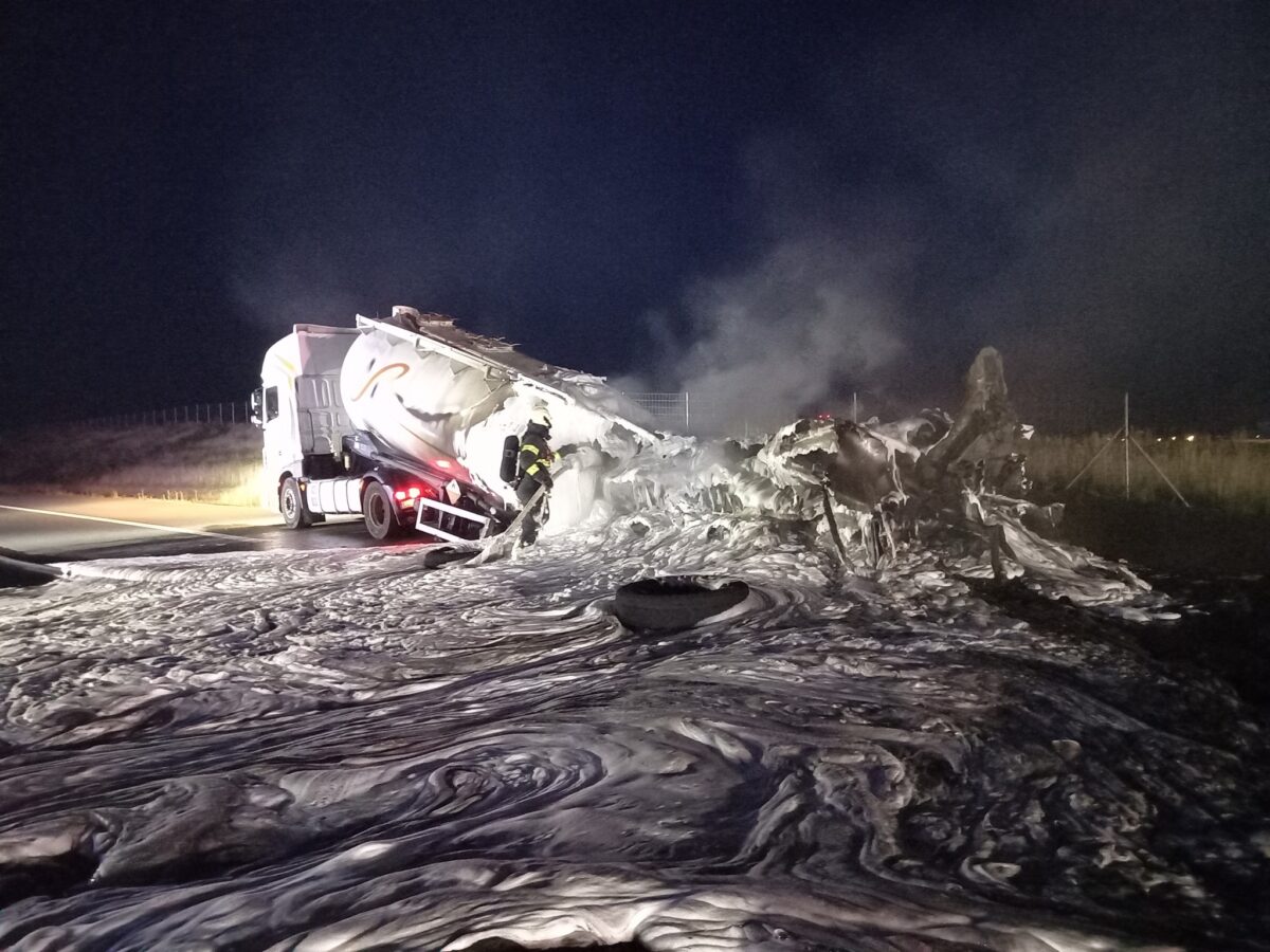 Dvě minuty po dvacáté hodině vyjížděli hasiči z HS Hradec Králové-Pražská, CHS Hradec Králové a HS Jaroměř k požáru zadního kola cisternového návěsu nákladního vozidla na dálnici D11, na km 104 ve směru na Jaroměř.