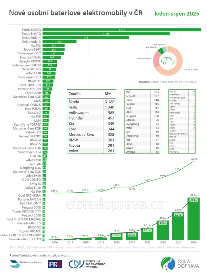 K 31. srpnu 2025 jezdilo po českých silnicích téměř 49,8 tisíc osobních bateriových elektromobilů. Během osmi měsíců přibylo 8 820 nově registrovaných vozidel, což představuje meziroční nárůst o 53 %. Bateriové elektromobily si tak letos drží 5,5% podíl na trhu s novými osobními vozidly – loni ve stejném období činil podíl 3,8 %. Žebříčku nejžádanějších […]