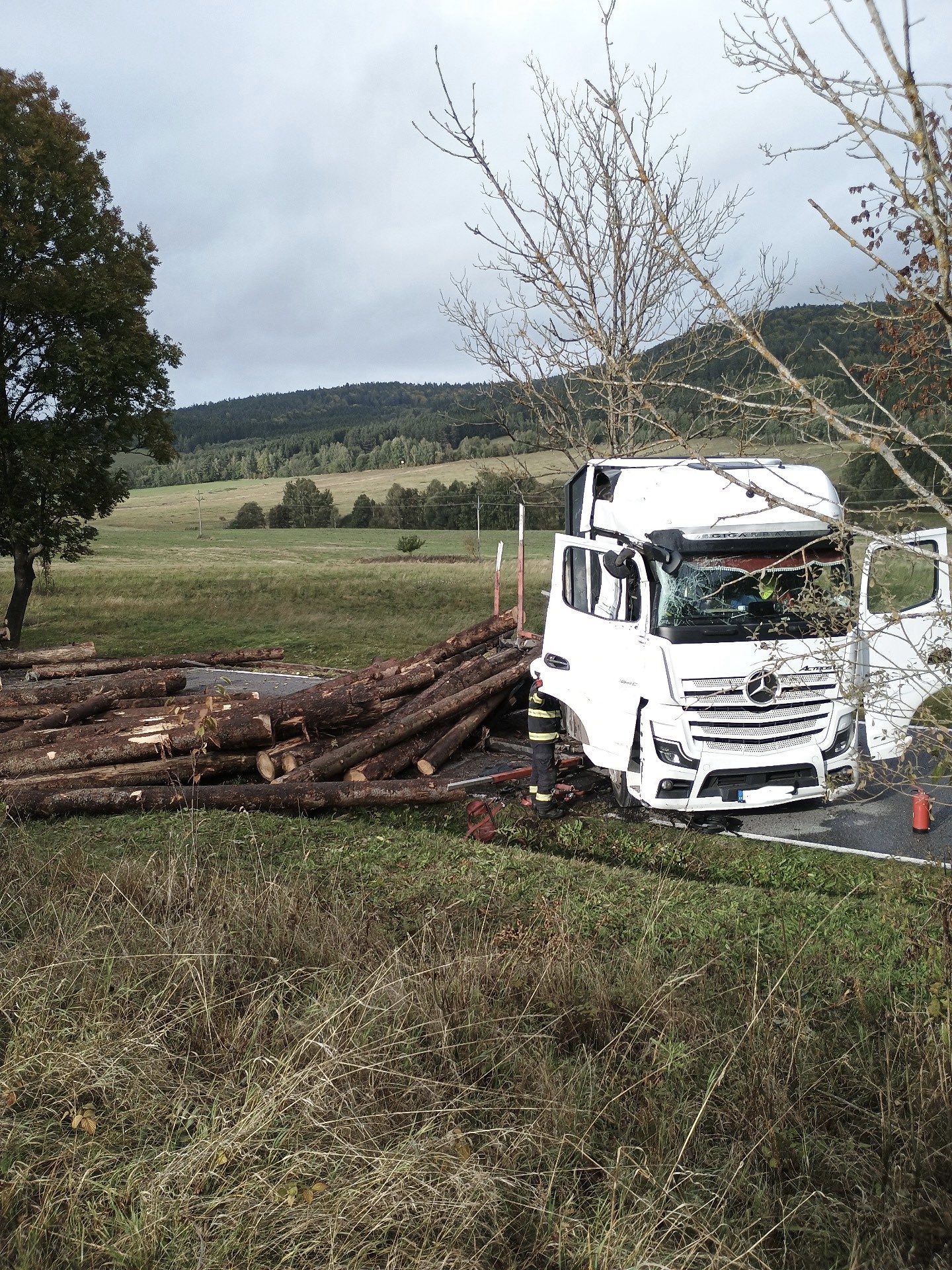 U dopravní nehody nákladního automobilu na silnice z Chvalšin na Smědeč zasahuje jednotka hasičů z Křemže.