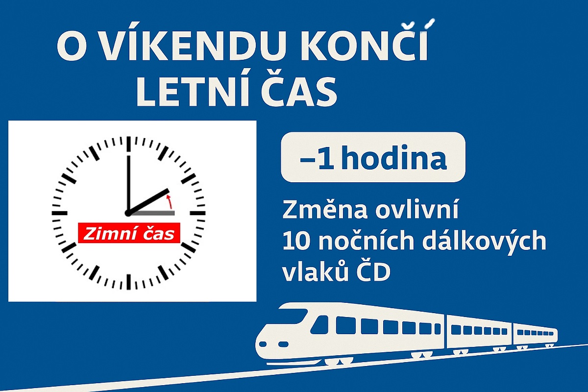 V noci ze soboty na neděli 25. / 26. října končí letní čas a hodinové ručičky si ve 3:00 hod. posuneme o hodinu zpět. Na cestě bude tou dobou desítka dálkových vlaků Českých drah s ubytovacími vozy, které České dráhy provozují ve spolupráci se zahraničními partnerskými dopravci. Ty uprostřed noci vyčkají na odjezd podle středoevropského času (SEČ). Pokud by tyto spoje nezůstaly stát, jely by po změně času ve zbytku trasy o hodinu dříve. Regionálních vlaků se hodinové čekání týkat nebude, protože v době přechodu na nový čas žádné nejedou. Ranní vlaky pak vyjedou již podle SEČ.