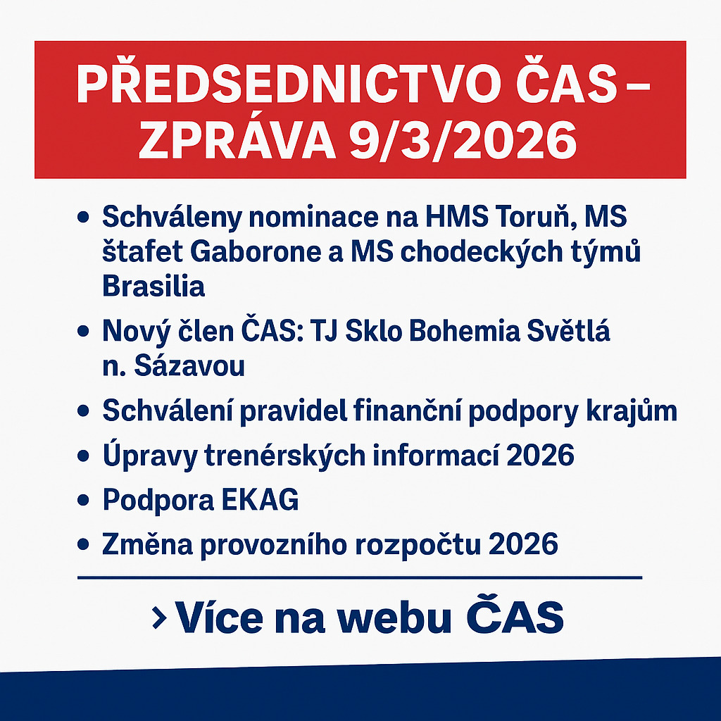 Předsednictvo Českého atletického svazu se sešlo 9. března 2026 pod vedením předsedy ČAS Libora Varhaníka. Na programu byla řada organizačních i sportovních bodů včetně schvalování nominací na blížící se mezinárodní atletické akce.