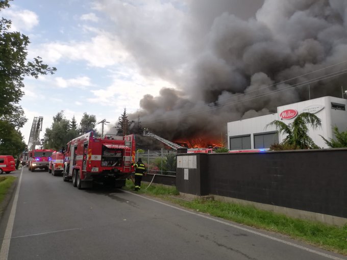 - Na místě zasahuje 7 profesionálních a 9 dobrovolných jednotek. Vyhlášen byl třetí stupeň poplachu a byl zřízen štáb velitele zásahu