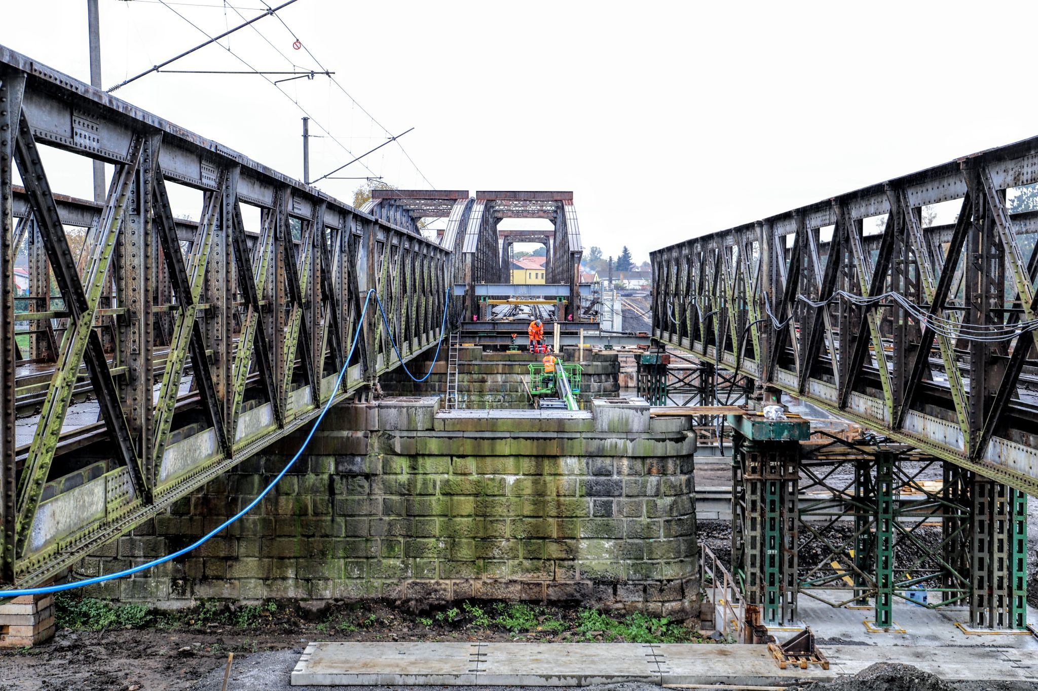 První dvě nosné konstrukce (2x 27,6 m) mostu přes Labe v Čelákovicích jsou přesunuty do provizorní polohy, následovat bude přesun konstrukcí s oblouky (2x 50,5 m). Nový železniční most bude stavebně připravený na investici města Čelákovice – zavěšení lávky pro pěší a cyklisty.