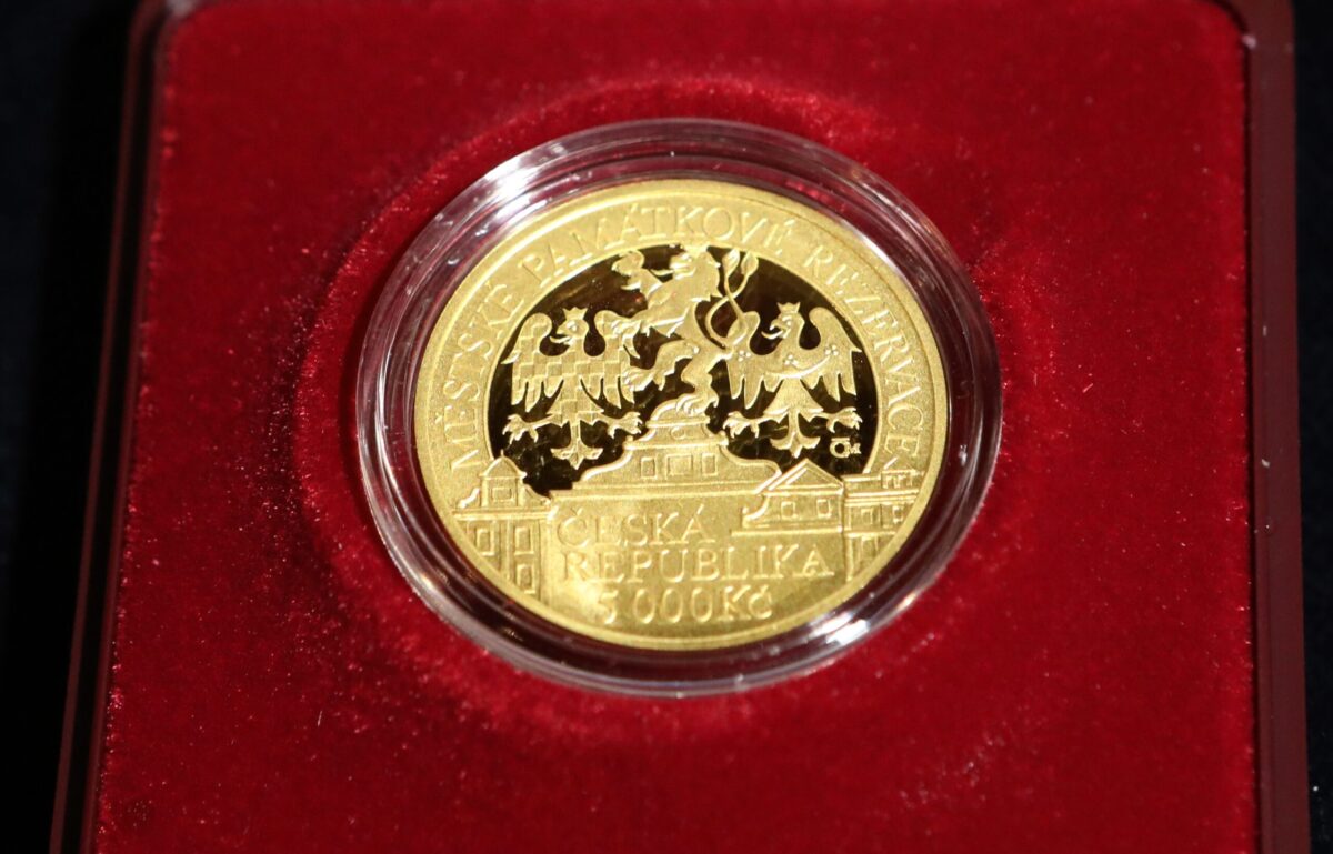 zlatou minci nominální hodnoty 5 000 Kč s motivy města Litoměřice