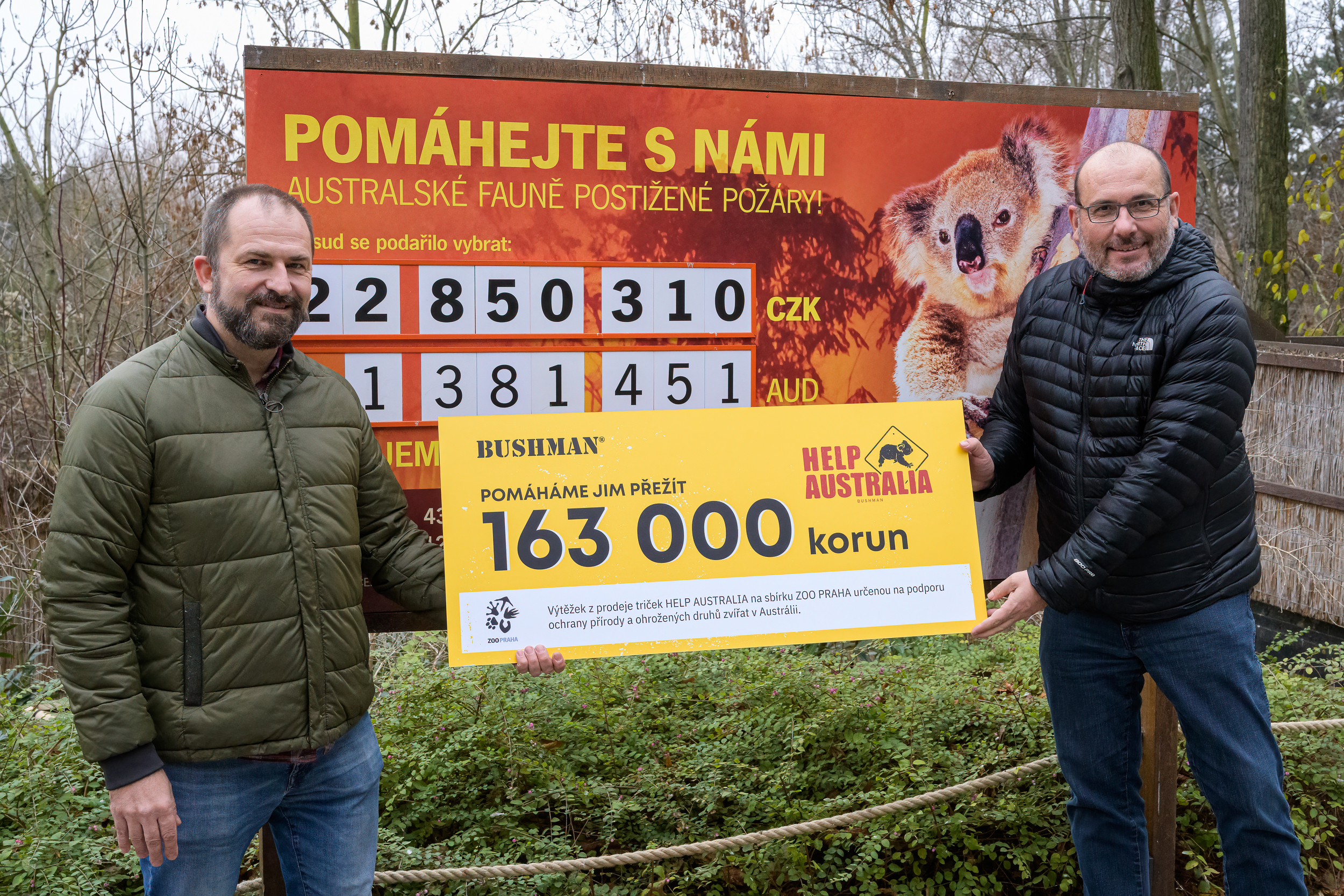 Značka BUSHMAN na konci roku předala pražské zoo šek na 163 tisíc korun. Dosavadní výtěžek z prodeje triček HELP AUSTRALIA poputuje na sbírku „Pomáháme jim přežít“ určenou na podporu ochrany přírody a ohrožených druhů zvířat v Austrálii.
